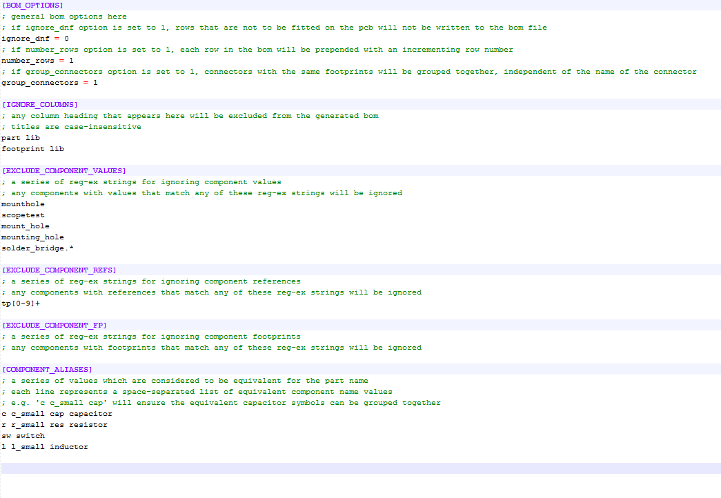 BoM generation options can be configured (on a per-project basis) by editing the bom.ini file in the PCB project directory. This file is generated the first time that the KiBoM script is run, and allows configuration of the following options.
